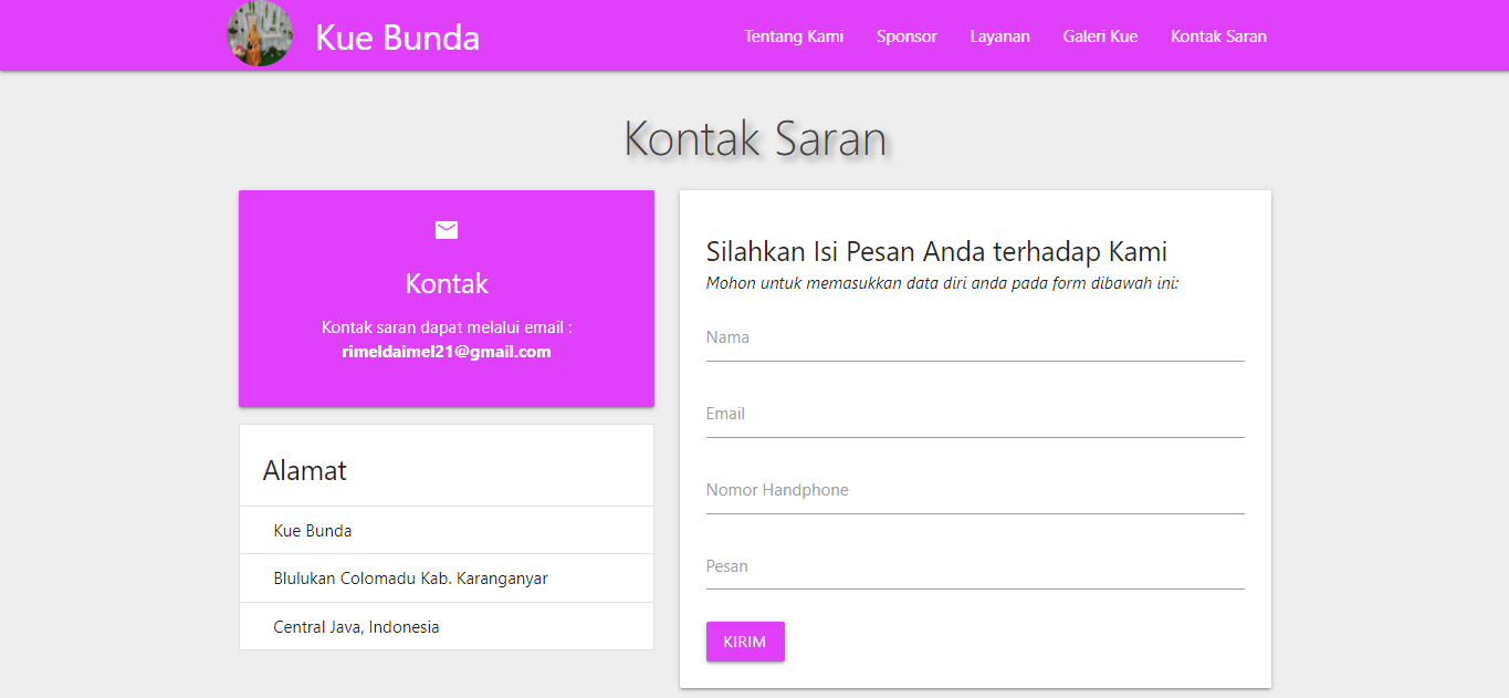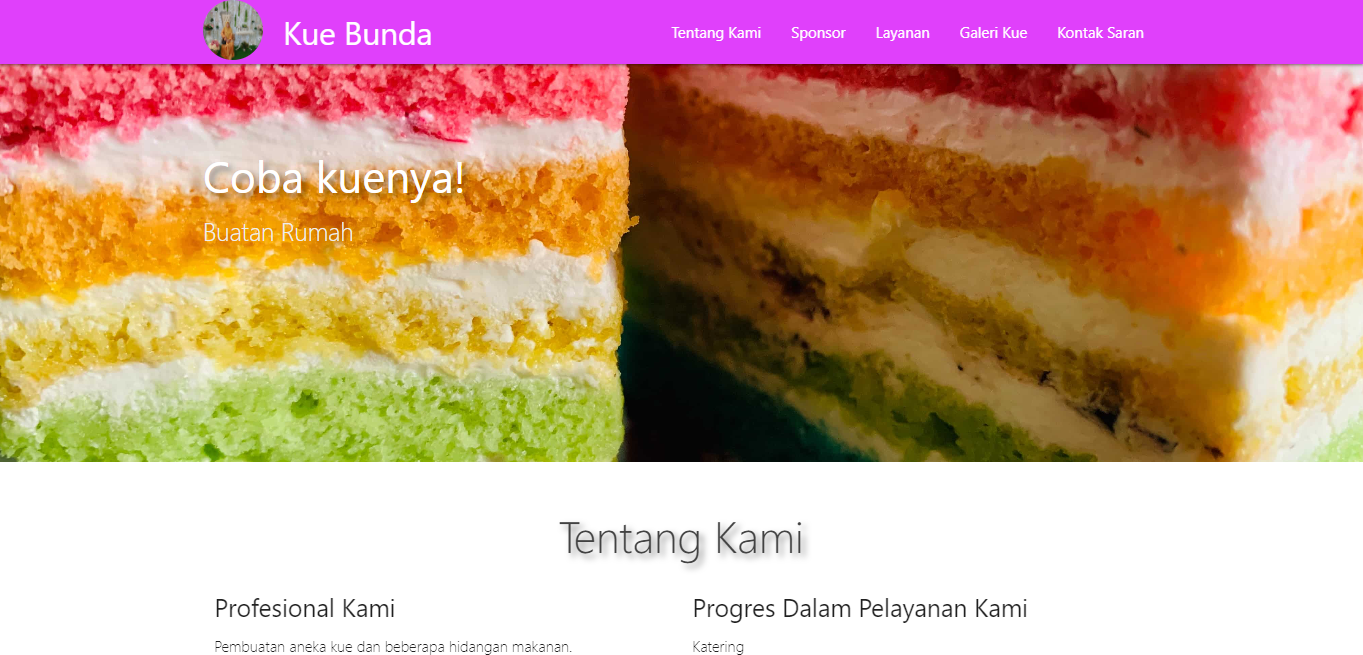Website kue bunda ini menampilkan macam-macam kue yang sangat menggugah selera dari macam-macam kue kering untuk lebaran hingga kue basah seperti kue lapis dan lainnnya. Pada menu tampilan kue ditampilkan semenarik mungkin dengan beberapa teknologi aplikasi web sehingga menarik untuk dilihat.