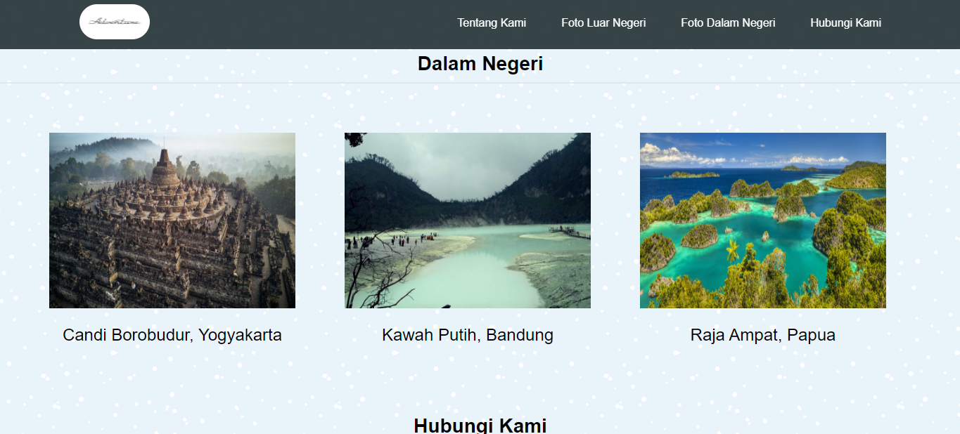 Website wisata ini menampilkan beberapa tempat wisata dari wisata lokal dan tempat wisata luar negeri yang populer. Dengan menggunakan teknologi website terbaik dan praktis dengan animasi yang menarik, website ini berhasil memikat anda untuk berlibur di tempat wisata yang kami sajikan.